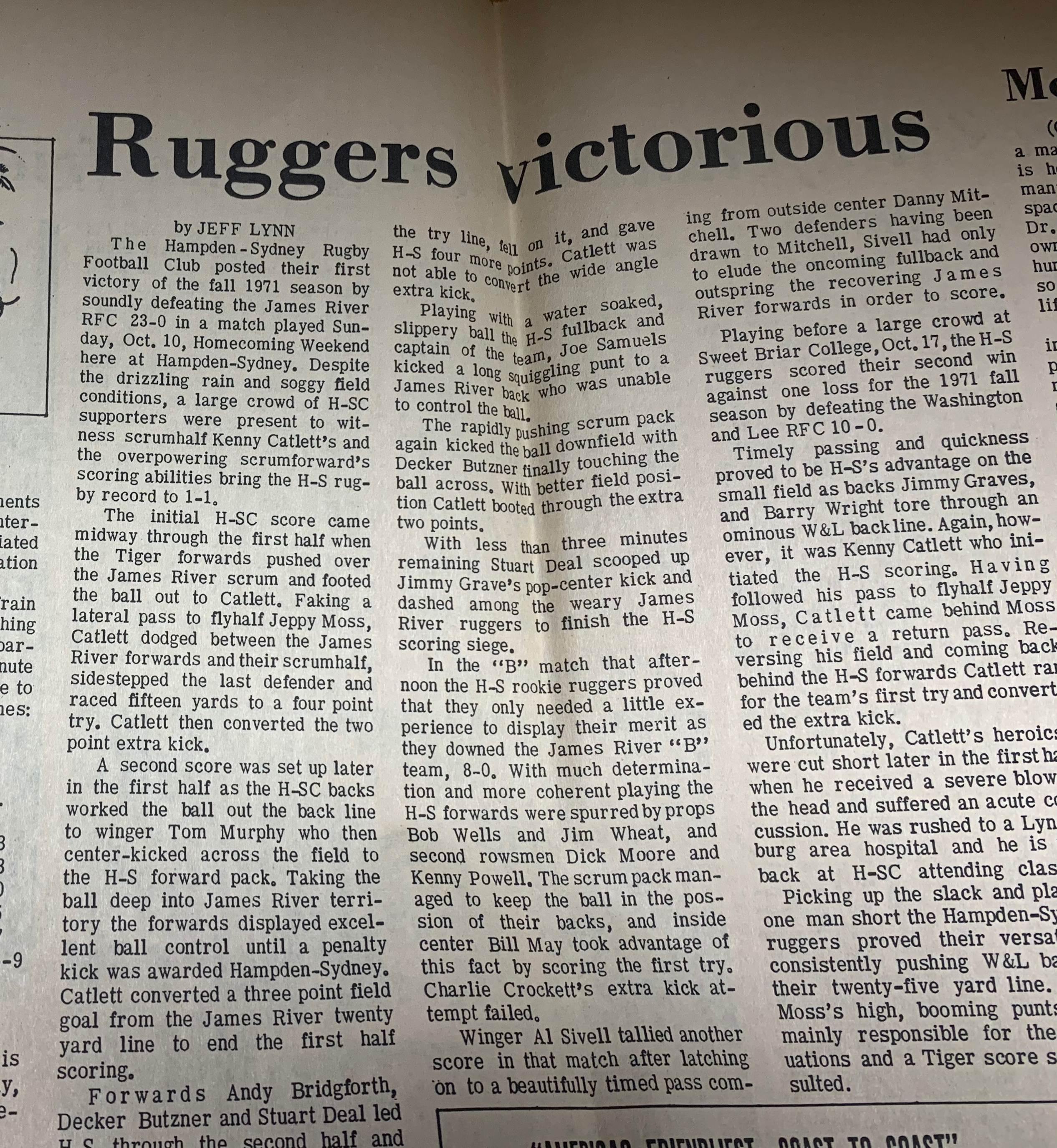 Sammy got us out for the rugby team and that proved to be a great social experience if not a great sporting experience. We practiced out behind the commons, Winston Hall. Sammy and a couple of other seniors ran the practice and it was very low key. We spent a lot of time playing the game. It was fun as opposed to having Coach Chalmers try to twist your head and helmet off and Coach Robinson trying to motivate you by slyly implying that you were falling short, far short.
